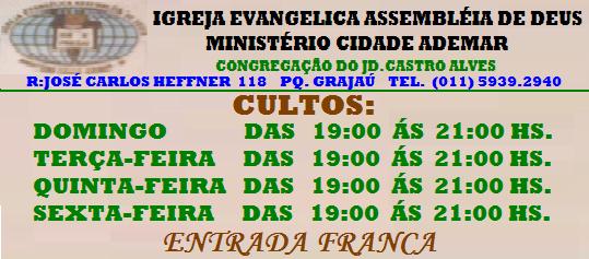 A IGREJA EVANGELICA ASSEMBLÉIS DE DEUS MINISTERIO CIDADE ADEMAR - CONGREGAÇÃO DO JD. CASTRO ALVES Temos a grata satisfação de estarmos nesta website para propagar a divina palavra de Deus e RESGATARMOS VIDA ONDE Á MORTE.
